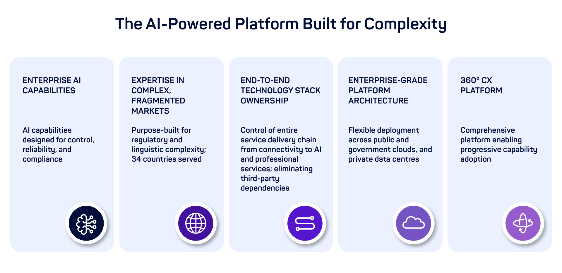 The company controls its entire technology and solution delivery stack, from connectivity infrastructure through to AI applications and professional services implementation, reducing reliance on third-party providers and enabling faster innovation cycles.